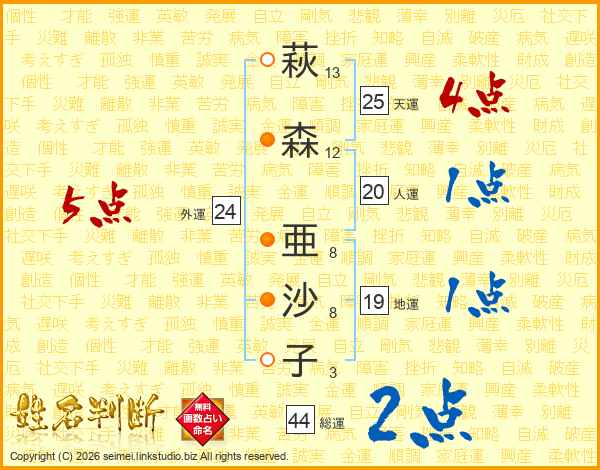 萩森亜沙子さんの総運は44画の2点!