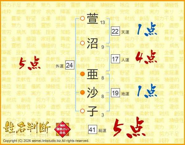 萱(13画)沼(9画) 亜(8画)沙(8画)子(3画)