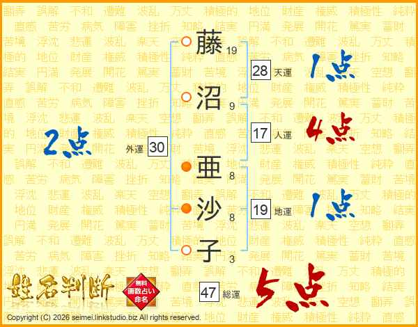 藤(19画)沼(9画) 亜(8画)沙(8画)子(3画)
