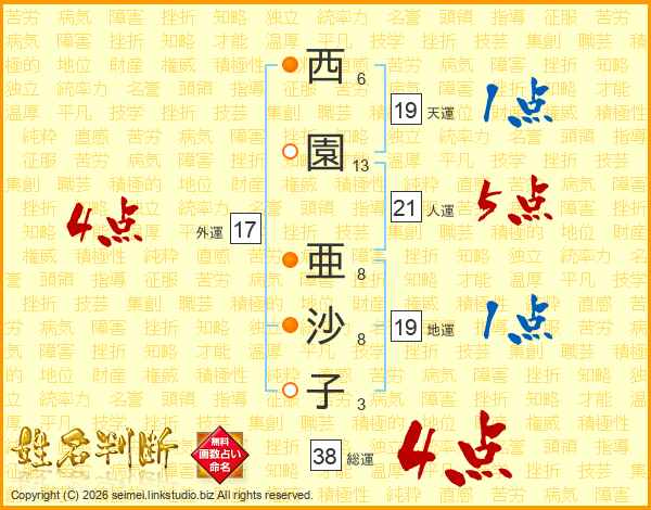 西園亜沙子さんの総運は38画の4点!