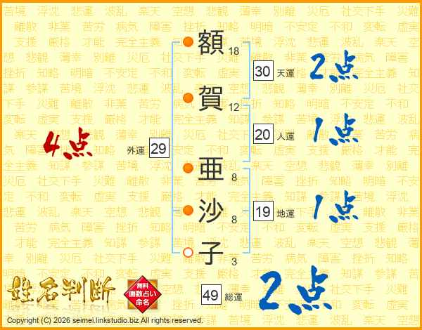 額(18画)賀(12画) 亜(8画)沙(8画)子(3画)