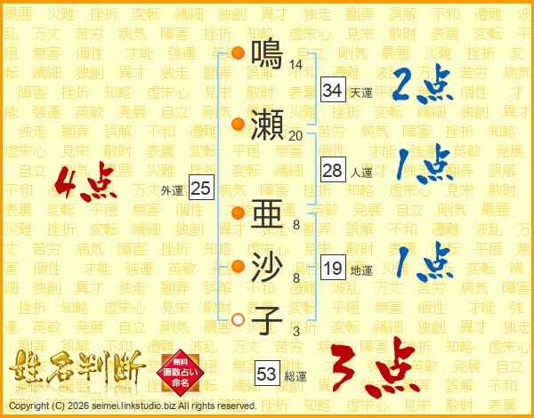 鳴(14画)瀬(20画) 亜(8画)沙(8画)子(3画)
