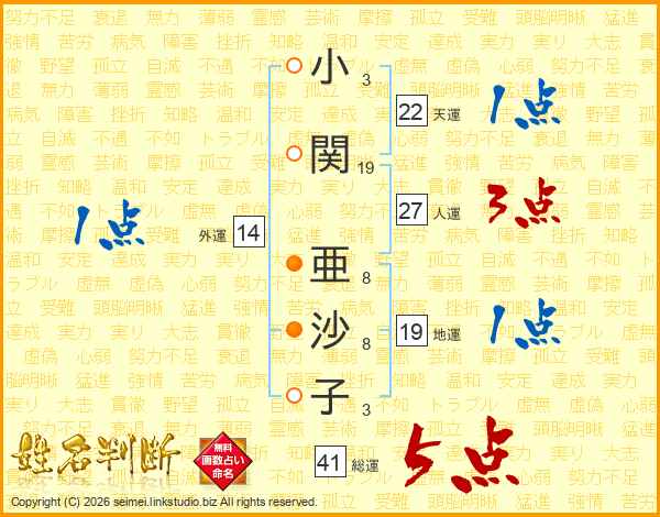 小(3画)関(19画) 亜(8画)沙(8画)子(3画)