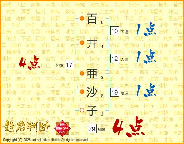 百(6画)井(4画) 亜(8画)沙(8画)子(3画)