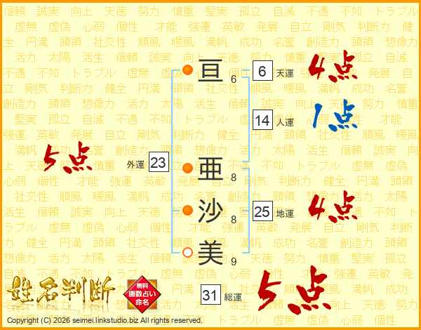 亘(6画) 亜(8画)沙(8画)美(9画)