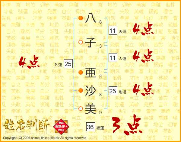 八(8画)子(3画) 亜(8画)沙(8画)美(9画)