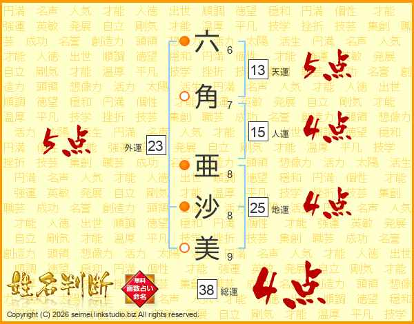 六(6画)角(7画) 亜(8画)沙(8画)美(9画)