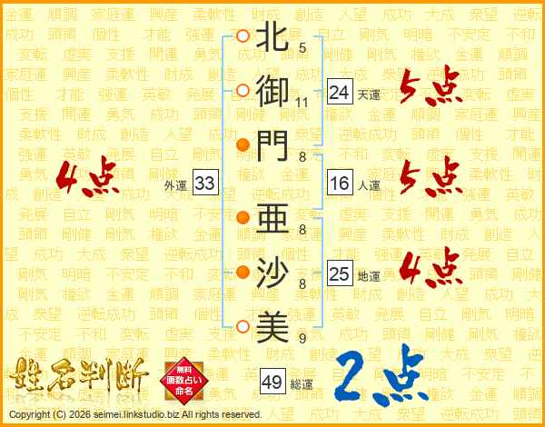 北御門亜沙美さんの総運は49画の2点!