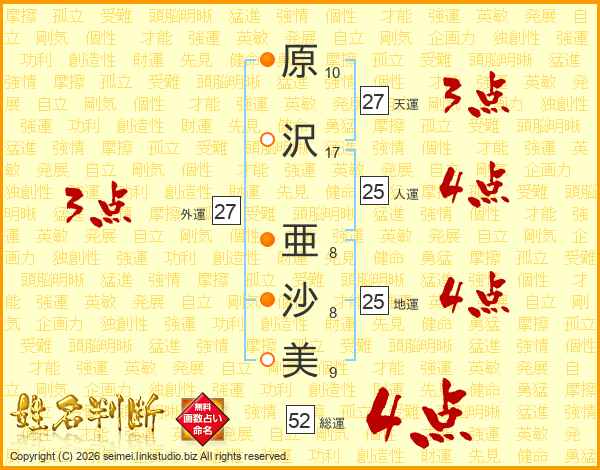 原(10画)沢(17画) 亜(8画)沙(8画)美(9画)