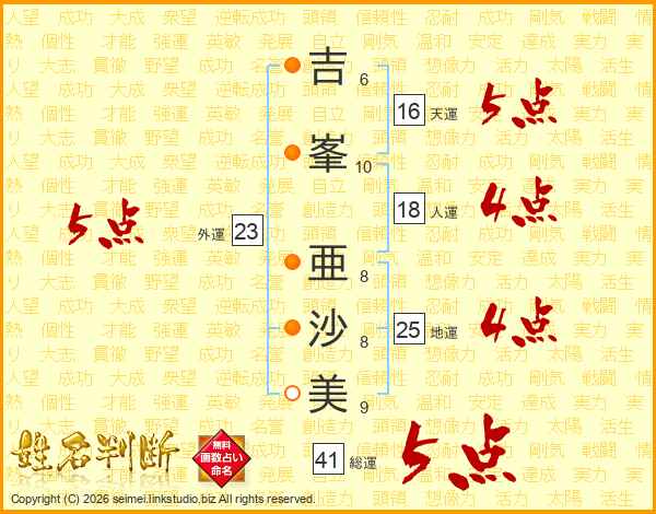 吉(6画)峯(10画) 亜(8画)沙(8画)美(9画)