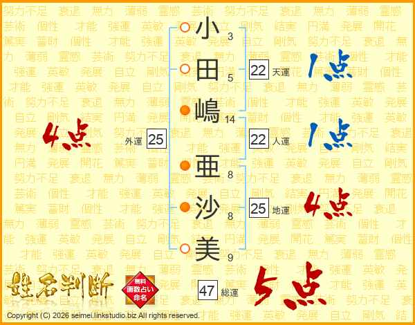 小(3画)田(5画)嶋(14画) 亜(8画)沙(8画)美(9画)