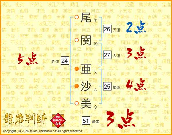 尾(7画)関(19画) 亜(8画)沙(8画)美(9画)