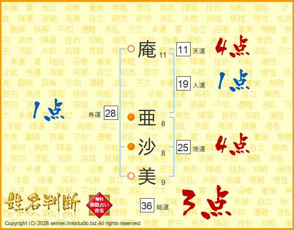 庵(11画) 亜(8画)沙(8画)美(9画)
