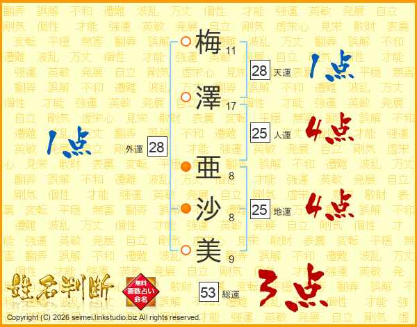 梅(11画)澤(17画) 亜(8画)沙(8画)美(9画)