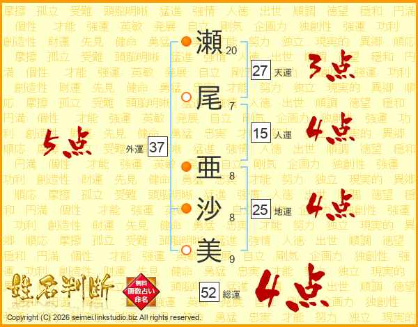 瀬(20画)尾(7画) 亜(8画)沙(8画)美(9画)