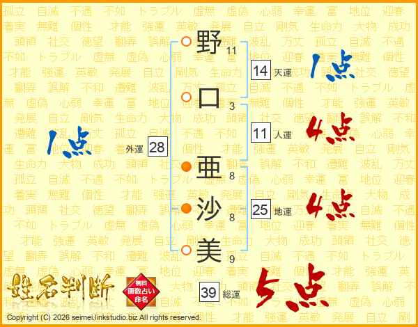 野(11画)口(3画) 亜(8画)沙(8画)美(9画)