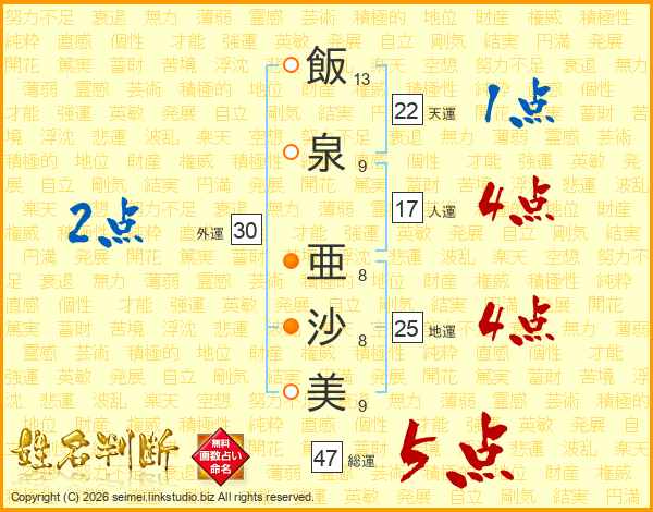 飯(13画)泉(9画) 亜(8画)沙(8画)美(9画)