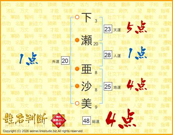 下(3画)瀬(20画) 亜(8画)沙(8画)美(9画)