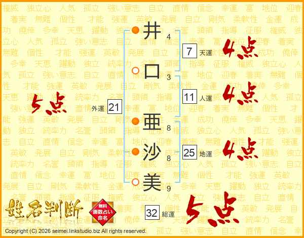 井(4画)口(3画) 亜(8画)沙(8画)美(9画)