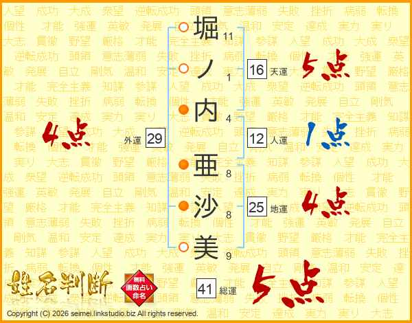 堀(11画)ノ(1画)内(4画) 亜(8画)沙(8画)美(9画)