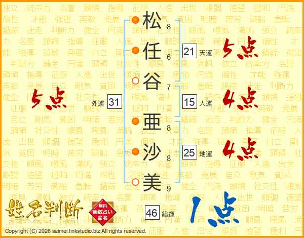 松(8画)任(6画)谷(7画) 亜(8画)沙(8画)美(9画)