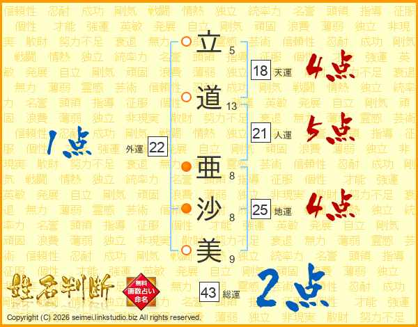 立(5画)道(13画) 亜(8画)沙(8画)美(9画)