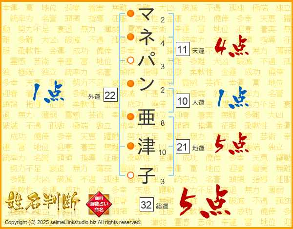 マネパン亜津子さんの地運は21画の5点!