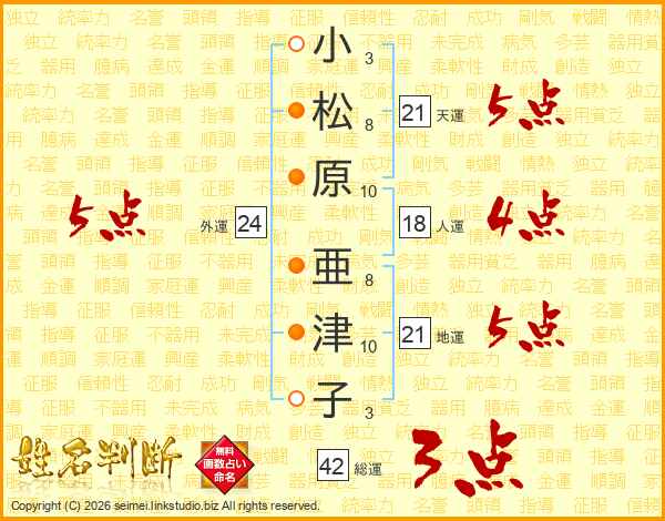 小(3画)松(8画)原(10画) 亜(8画)津(10画)子(3画)
