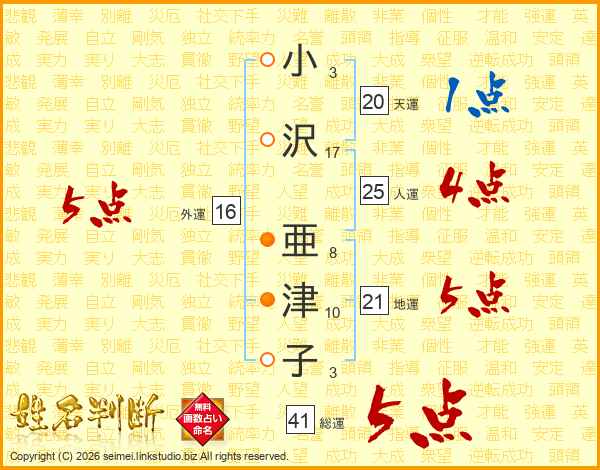 小(3画)沢(17画) 亜(8画)津(10画)子(3画)