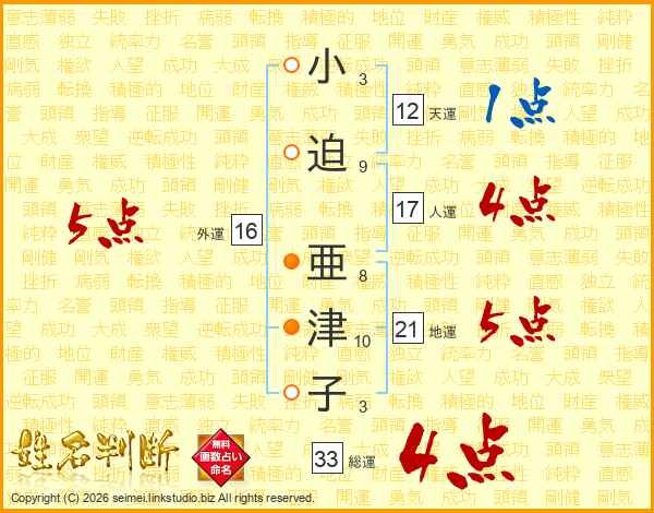 小(3画)迫(9画) 亜(8画)津(10画)子(3画)