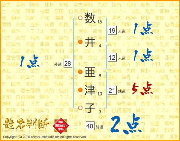 数(15画)井(4画) 亜(8画)津(10画)子(3画)