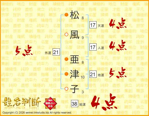 松(8画)風(9画) 亜(8画)津(10画)子(3画)