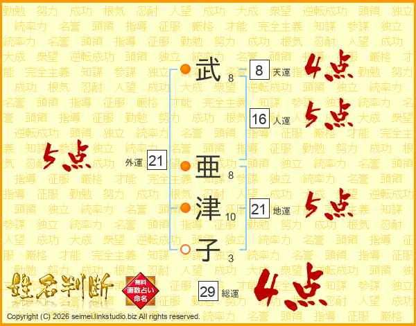武(8画) 亜(8画)津(10画)子(3画)