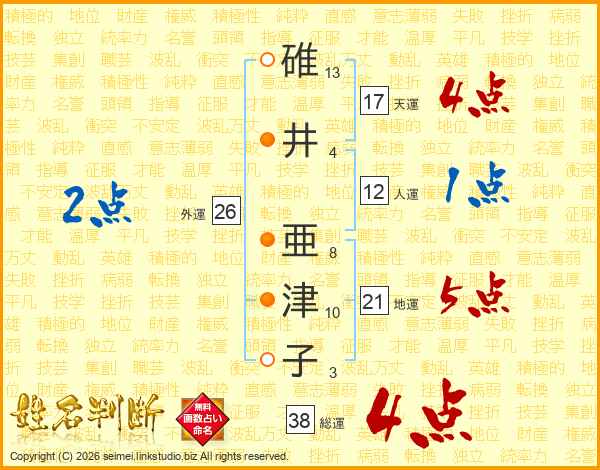 碓(13画)井(4画) 亜(8画)津(10画)子(3画)