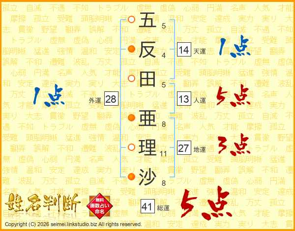 五(5画)反(4画)田(5画) 亜(8画)理(11画)沙(8画)