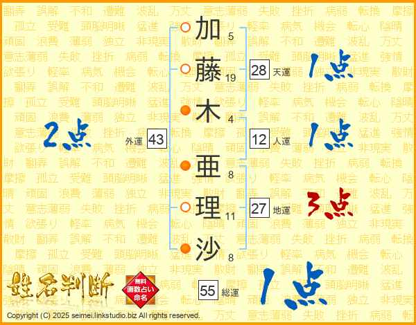 加(5画)藤(19画)木(4画) 亜(8画)理(11画)沙(8画)