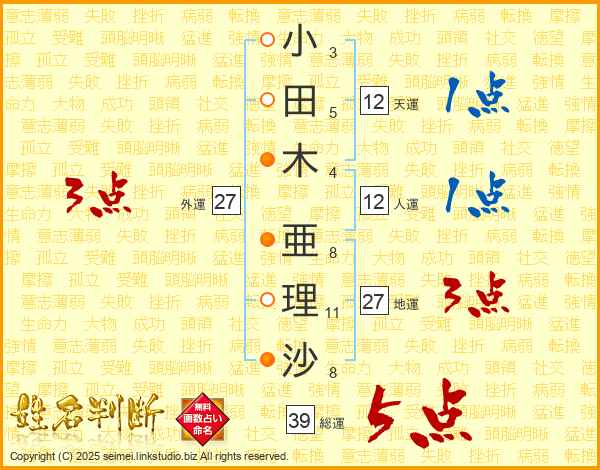 小(3画)田(5画)木(4画) 亜(8画)理(11画)沙(8画)
