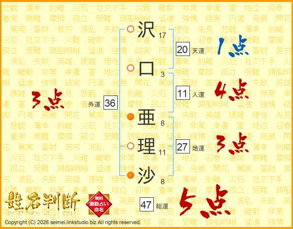 沢(17画)口(3画) 亜(8画)理(11画)沙(8画)