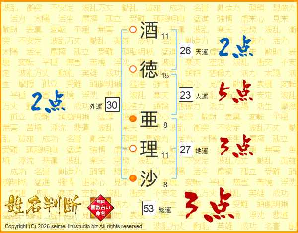 酒徳亜理沙さんの総運は53画の3点!