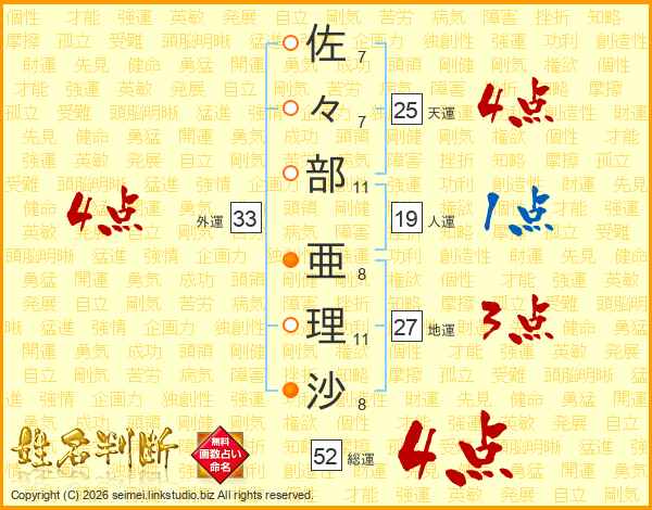 佐(7画)々(7画)部(11画) 亜(8画)理(11画)沙(8画)