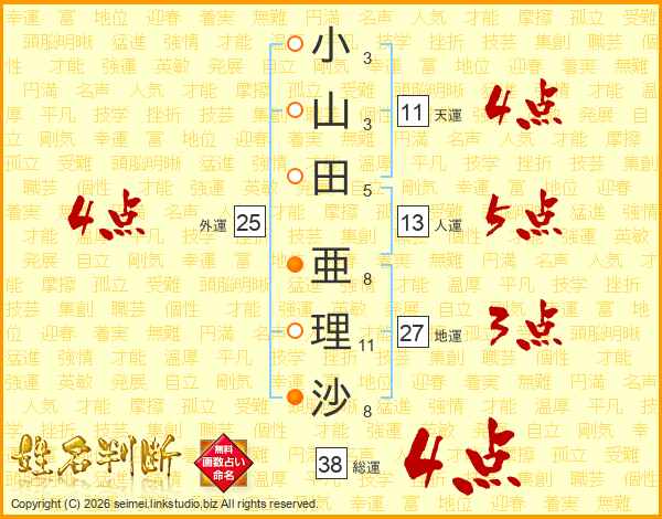 小(3画)山(3画)田(5画) 亜(8画)理(11画)沙(8画)