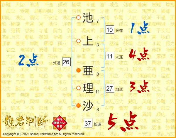 池(7画)上(3画) 亜(8画)理(11画)沙(8画)