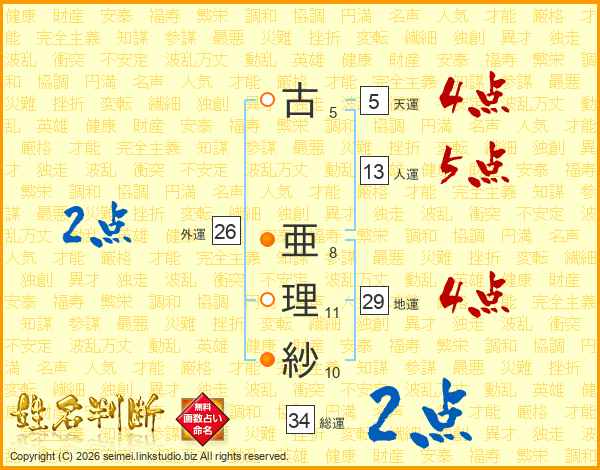 古亜理紗さんの総運は34画の2点!
