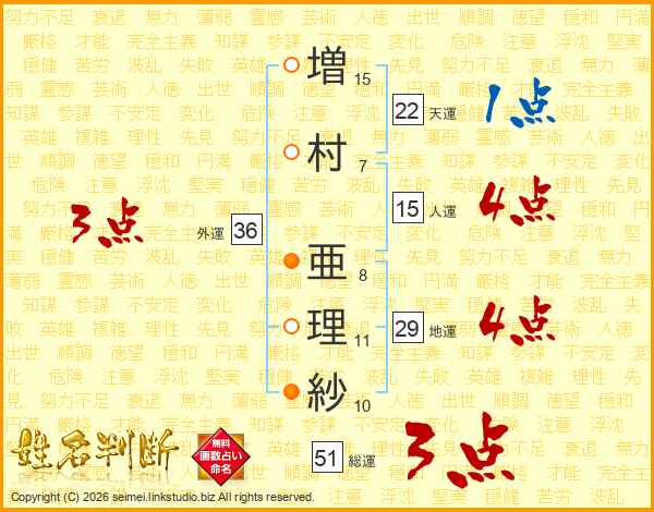 増(15画)村(7画) 亜(8画)理(11画)紗(10画)