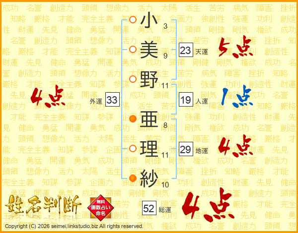 小(3画)美(9画)野(11画) 亜(8画)理(11画)紗(10画)