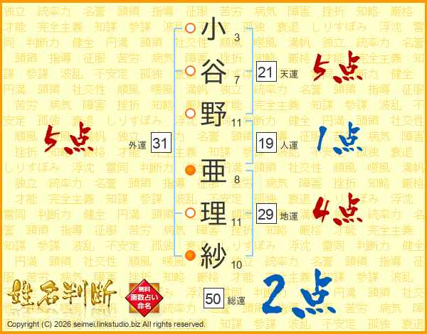 小(3画)谷(7画)野(11画) 亜(8画)理(11画)紗(10画)