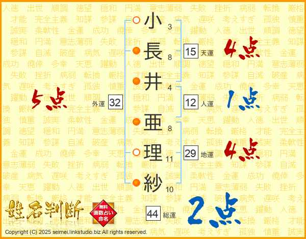 小長井亜理紗さんの総運は44画の2点!