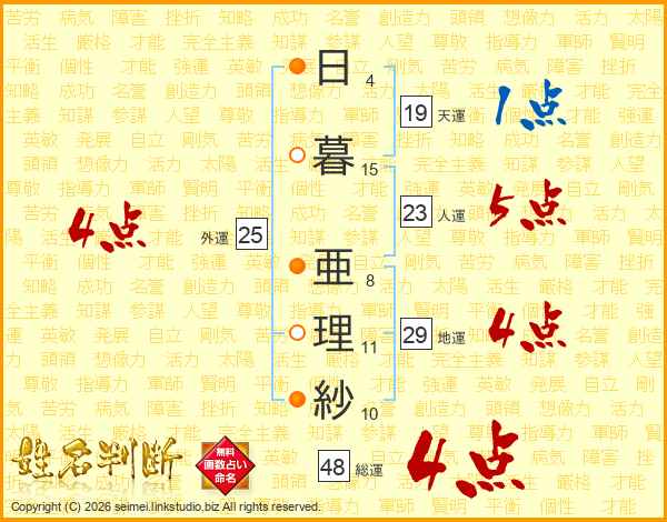 日(4画)暮(15画) 亜(8画)理(11画)紗(10画)