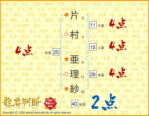 片(4画)村(7画) 亜(8画)理(11画)紗(10画)