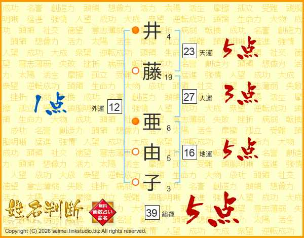 井(4画)藤(19画) 亜(8画)由(5画)子(3画)